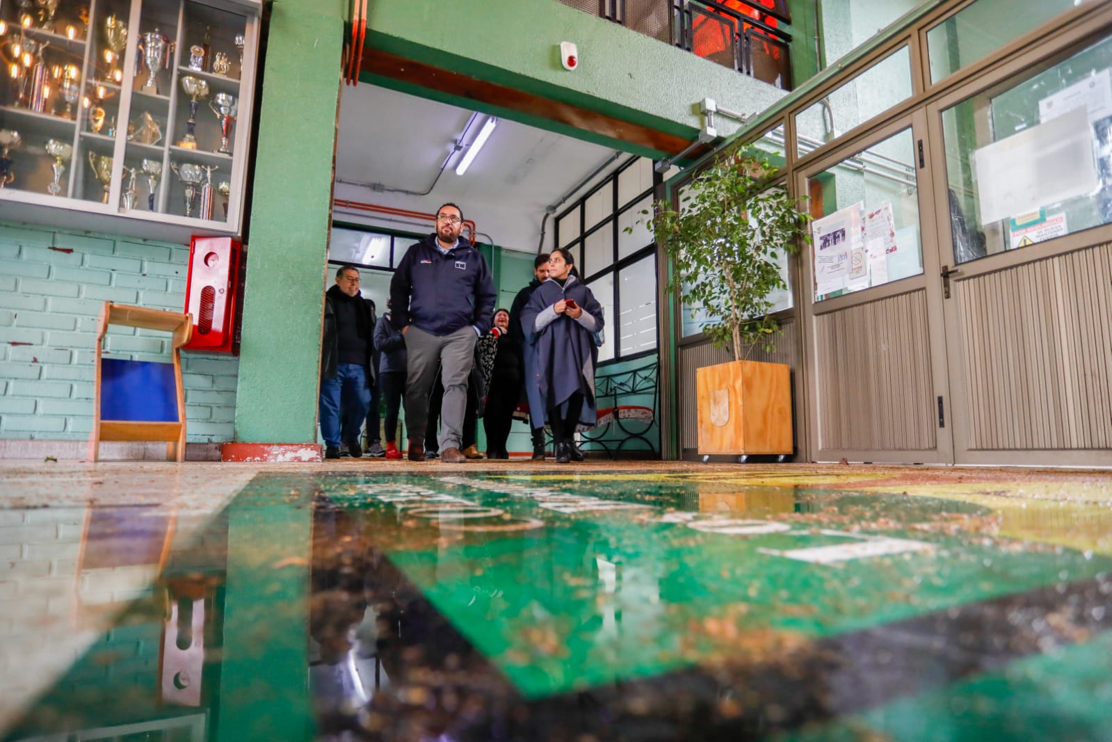 El ministro de Educación, Nicolás Cataldo, visitó este mediodía el Colegio Los Bosquinos, de Maipú, para evaluar el daño provocado en la infraestructura educacional a causa del sistema frontal que está afectando a la zona centro-sur del país. En la inspección participó la secretaria regional ministerial de Educación de la región Metropolitana, Raquel Solar.