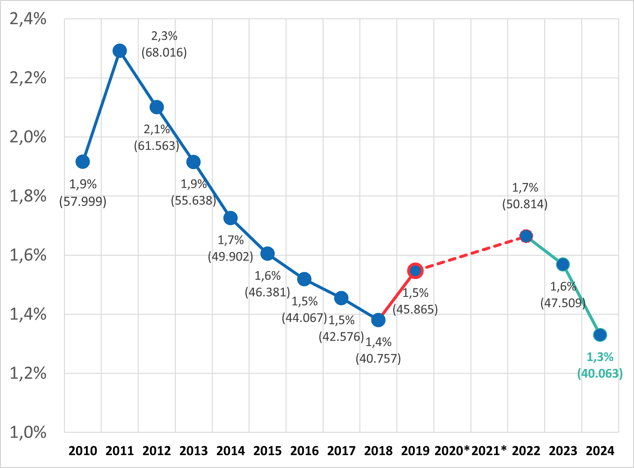 Con esta reducción, el 2024 registra la cifra más baja desde que existe información comparable (2010), ubicándose incluso por debajo del 1,4% alcanzado en 2018 (40.575 estudiantes), que hasta ahora constituía el mínimo histórico.