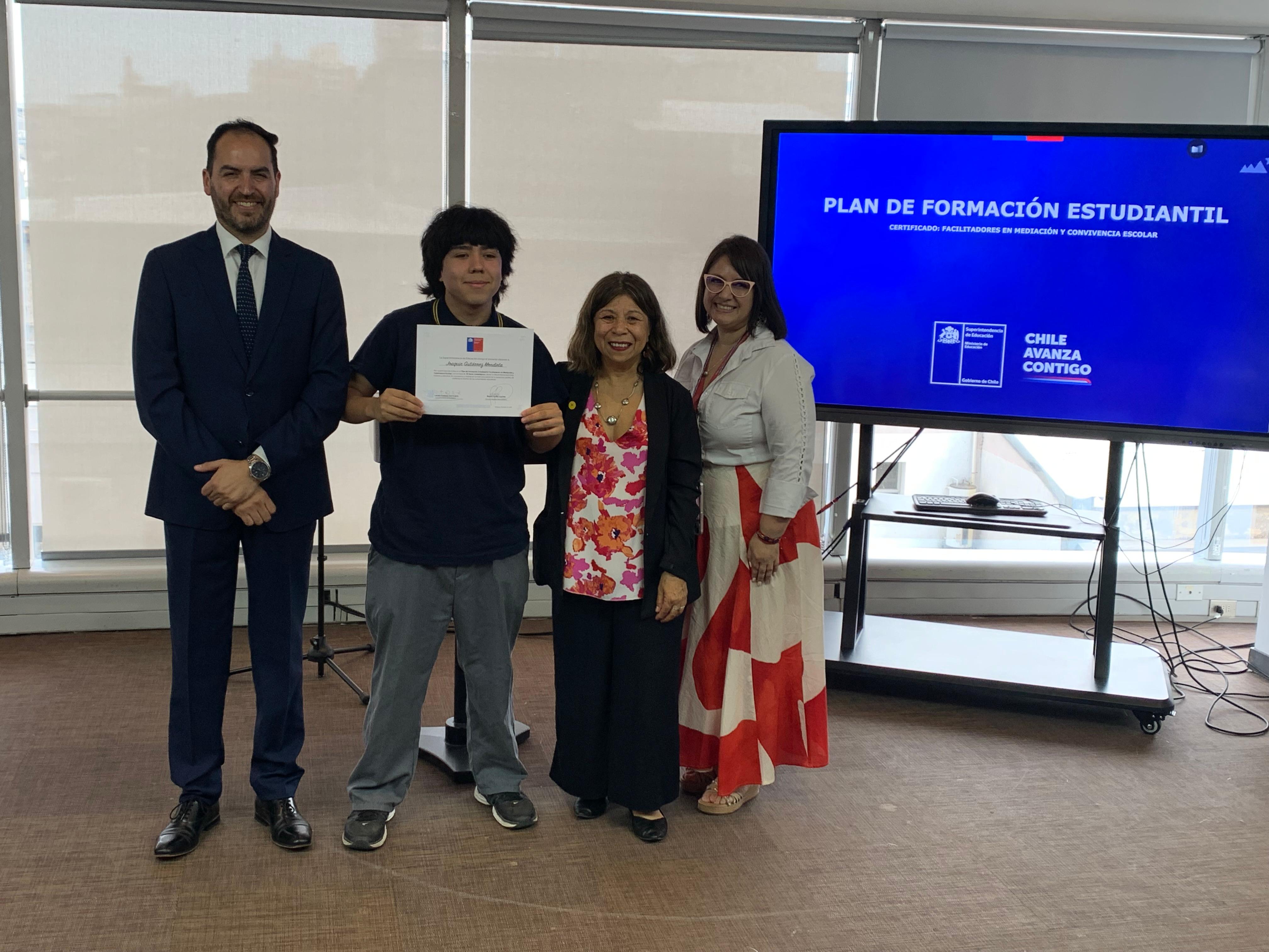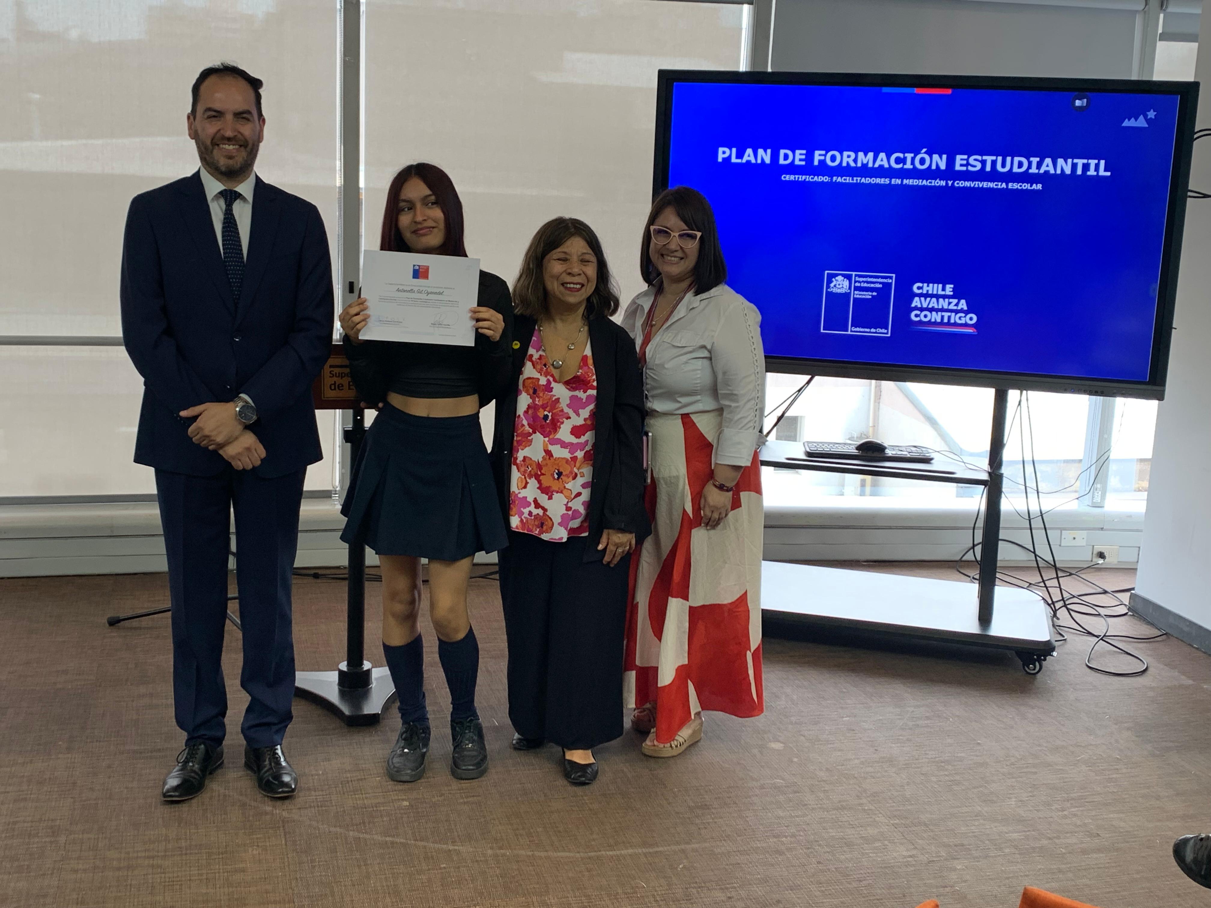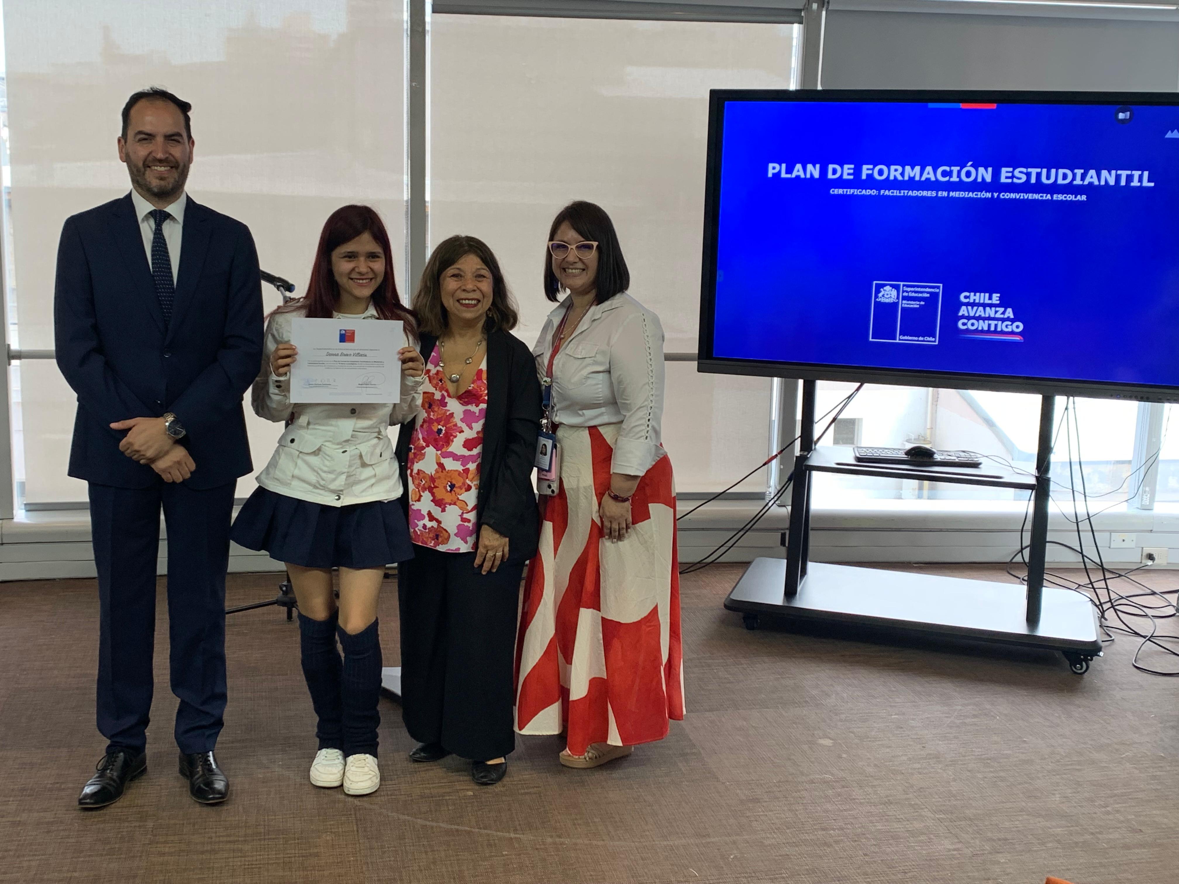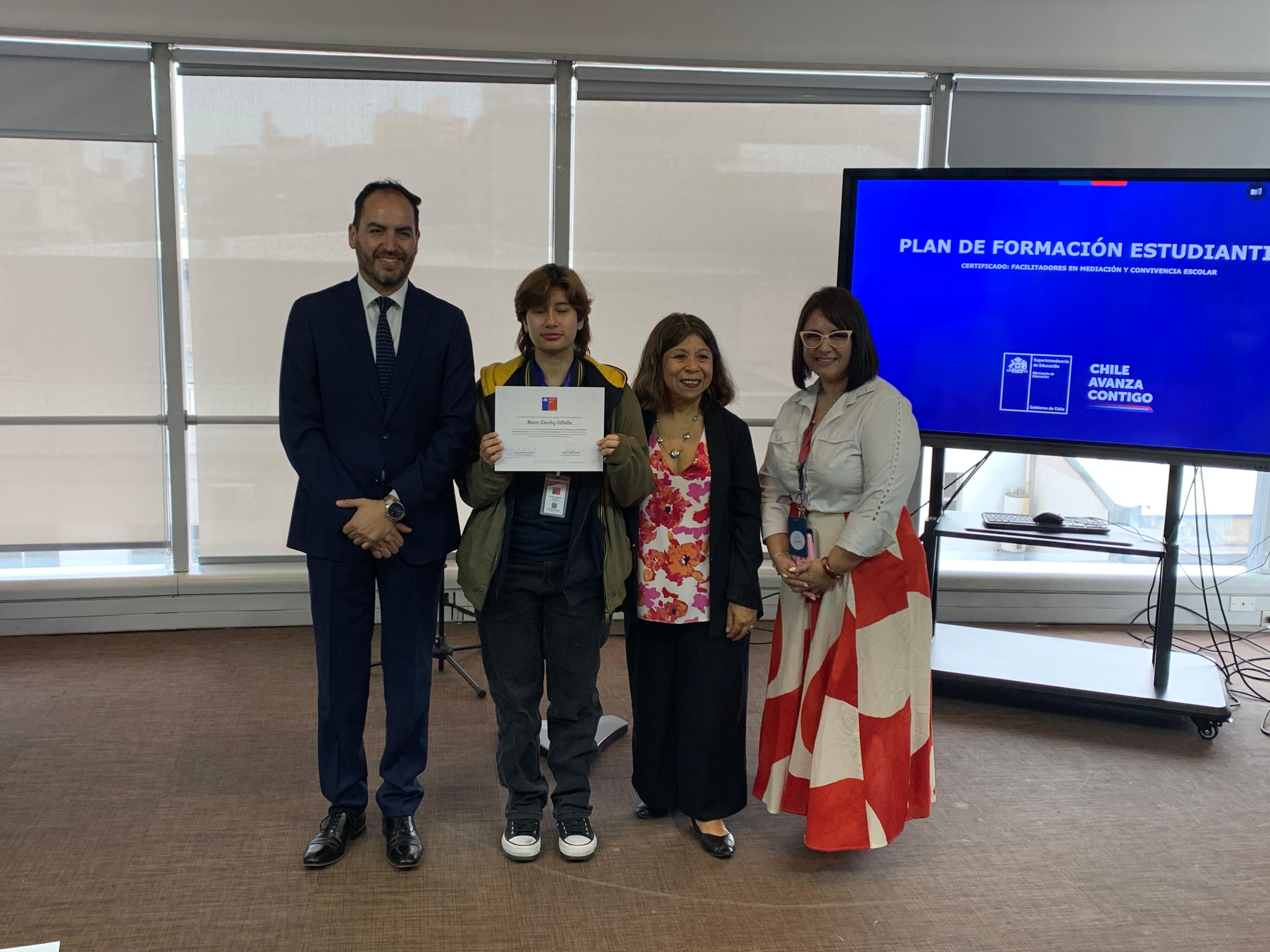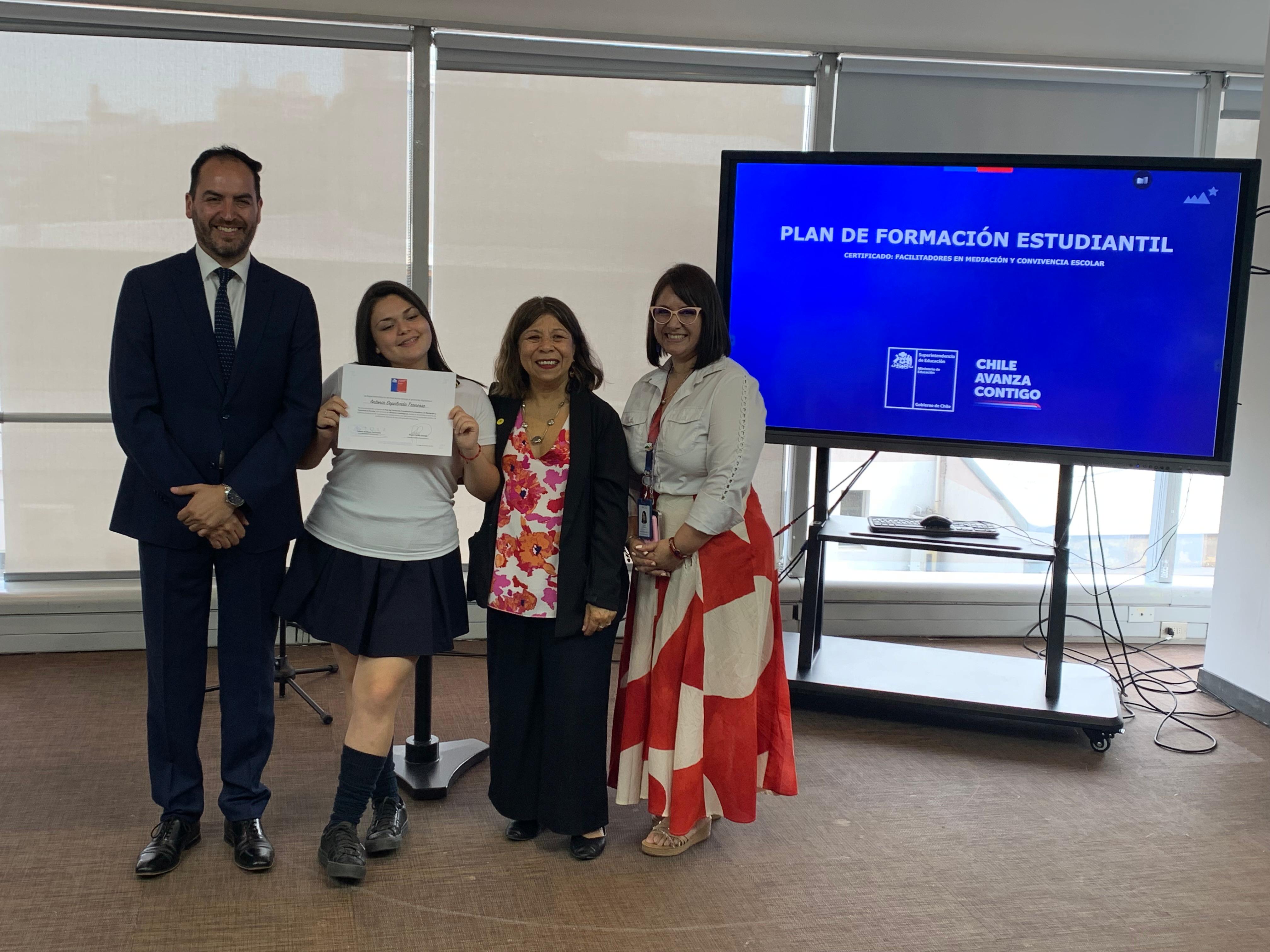 El pasado martes 9 de diciembre, en la Superintendencia de Educación, la Seremi de Educación de la Región Metropolitana, Raquel Solar Sánchez, junto al jefe provincial Talagante, Pablo Carrizo, y la jefa del Departamento Provincial Norte, Lilet Rozas, estudiantes de establecimientos educacionales de la región metropolitana recibieron la certificación que los acredita como facilitadores/as en Mediación y Convivencia Escolar.