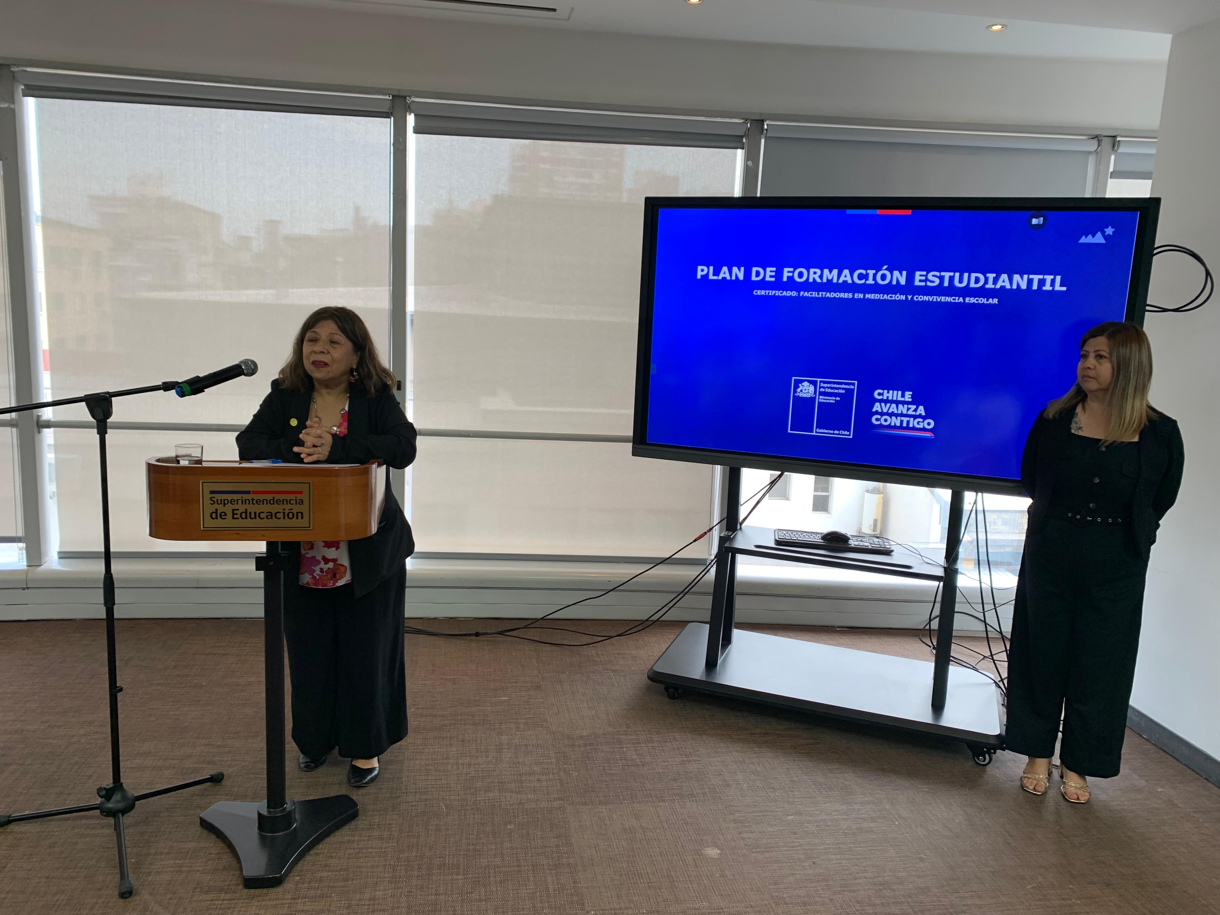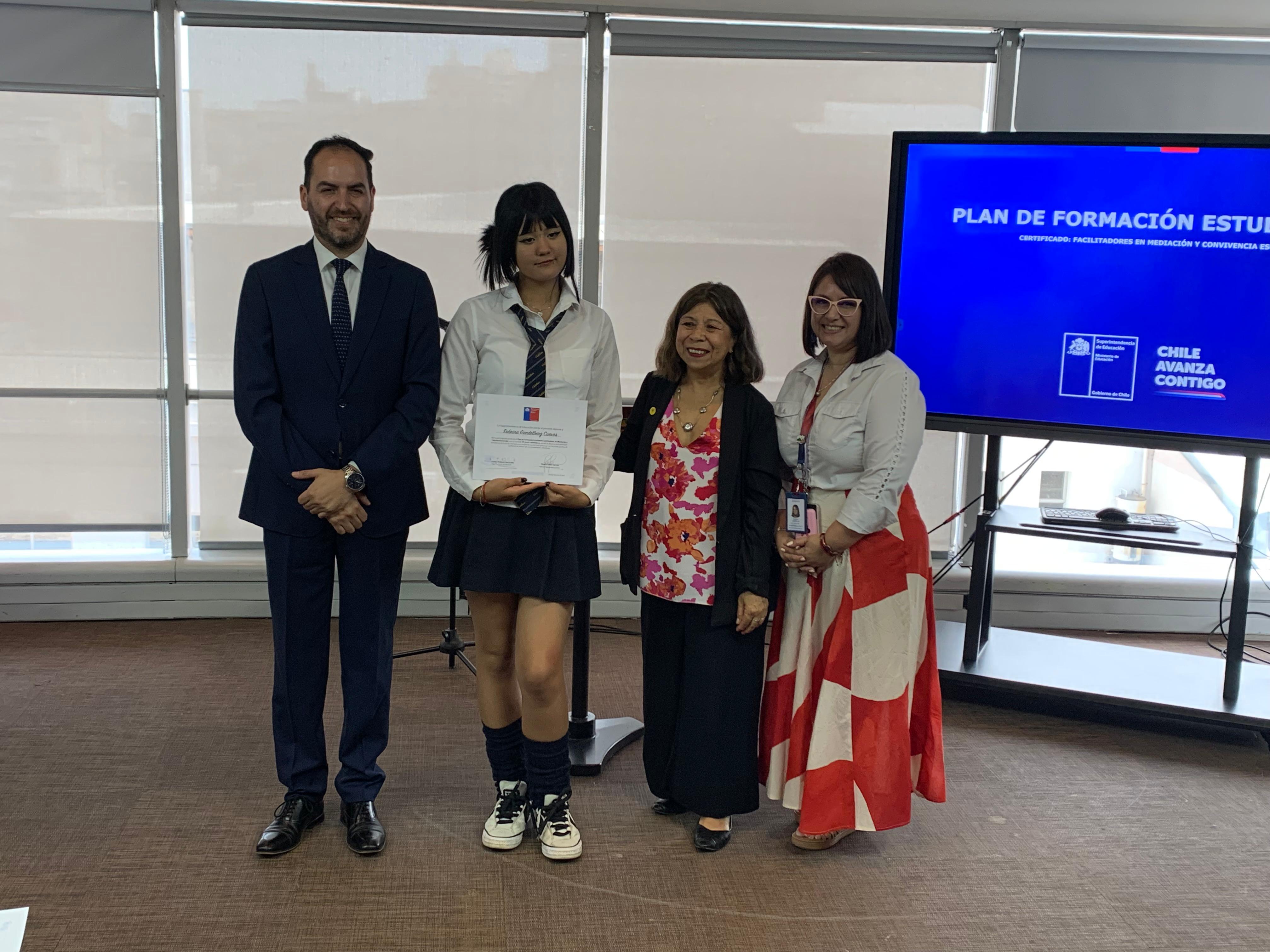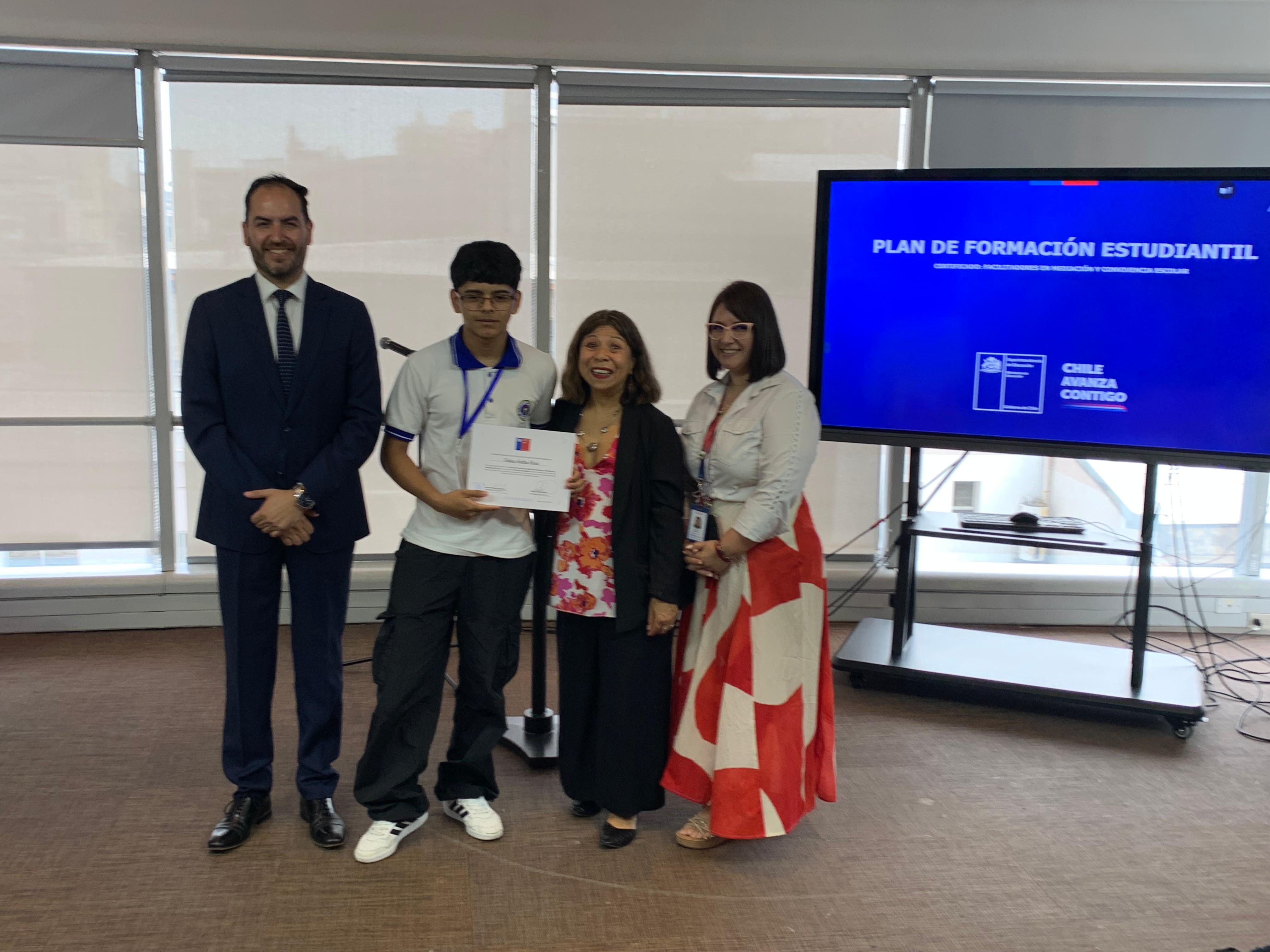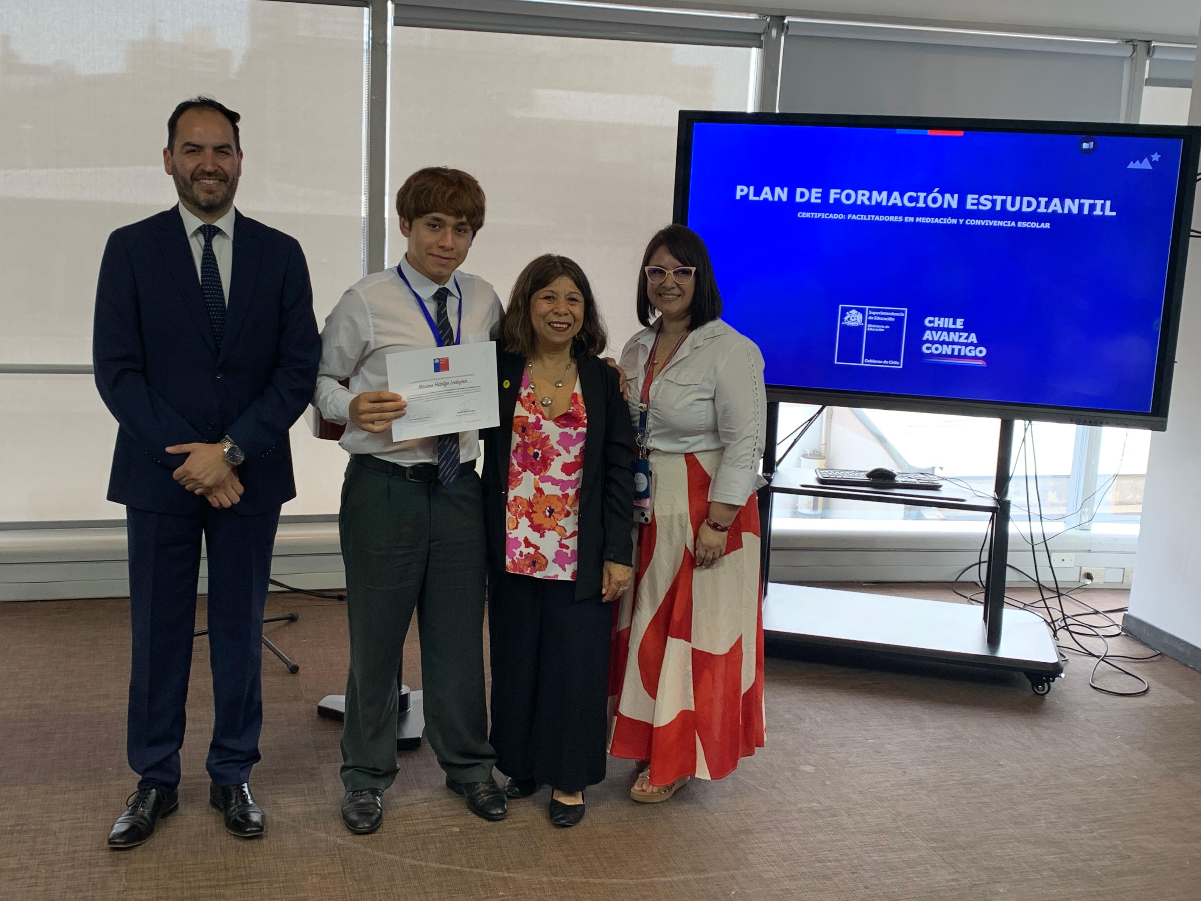 El pasado martes 9 de diciembre, en la Superintendencia de Educación, la Seremi de Educación de la Región Metropolitana, Raquel Solar Sánchez, junto al jefe provincial Talagante, Pablo Carrizo, y la jefa del Departamento Provincial Norte, Lilet Rozas, estudiantes de establecimientos educacionales de la región metropolitana recibieron la certificación que los acredita como facilitadores/as en Mediación y Convivencia Escolar.
